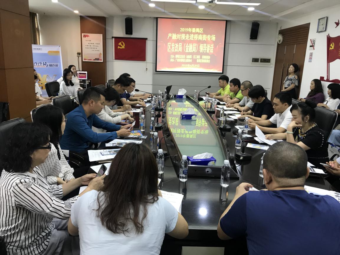 4月29日下午,“番禺区2019年产投融对接活动走进桥南街”专场,在街道办事处三楼会议室举办。区发改局金融科唐建国副科长、桥南街商会张勤常务副会长、金融协会谢沛森秘书长、陈华锋副秘书长、我会梁建君秘书长及我会有融资需求的16家企业代表、金融协会16家金融机构等共40多人参加活动。会议由我会梁建君秘书长主持。
