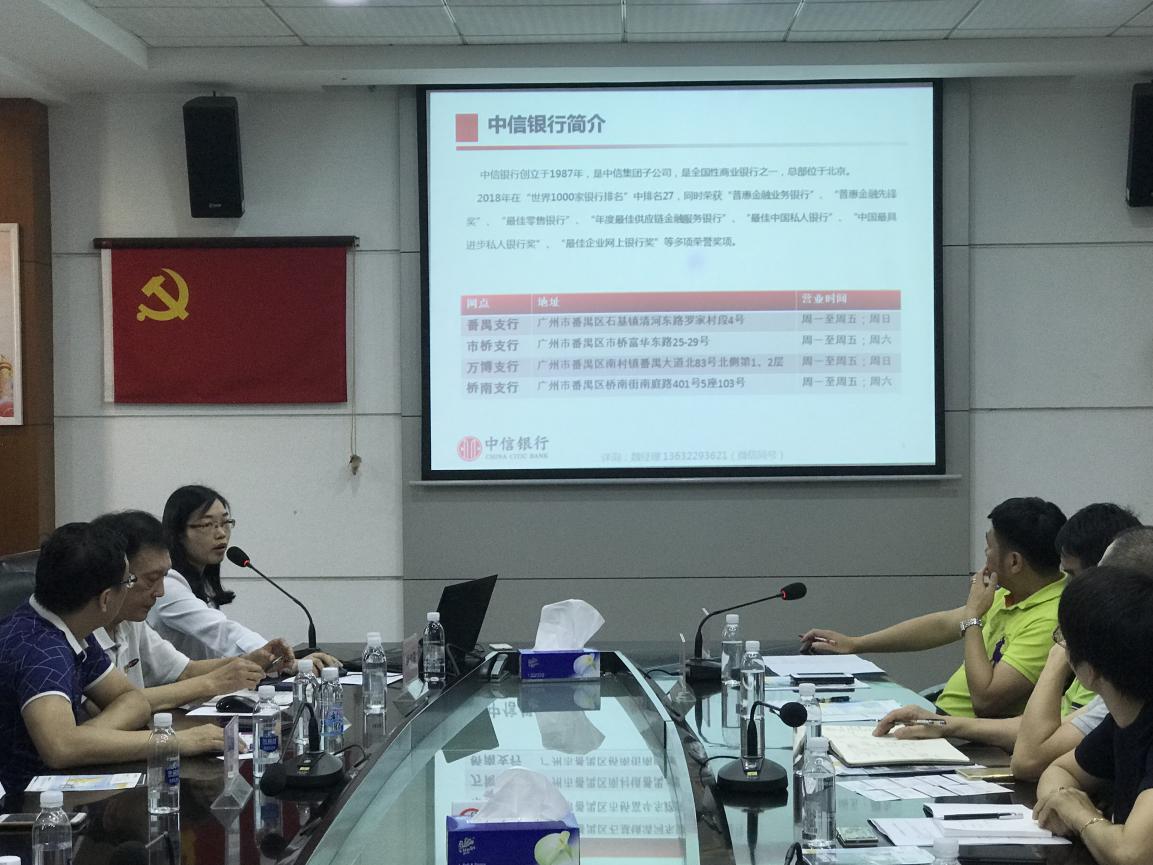本次活动安排了农商银行番禺支行、中信银行番禺支行、交通银行支行3家金融机构分别进行了“太阳连连贷”“科技贷”“供应链融资”“银税通”“线上抵押贷”等最新普惠金融产品的路演,中国银行、建设银行等多家银行机构也作了现场的简短发言,介绍了近期各自推出的特色金融产品以及针对中小微企业的普惠金融信贷政策。