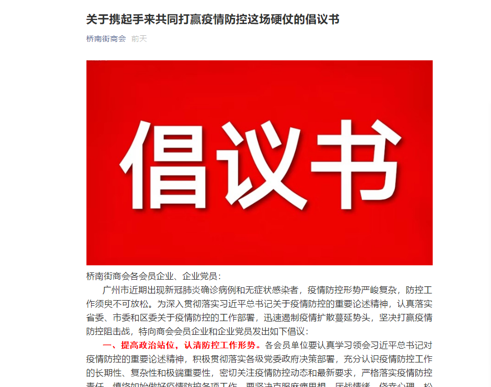 面对严峻的疫情,桥南街商会第一时间向全体会员发出《关于携起手来共同打赢疫情防控这场硬仗的倡议书》,引导会员认清防控工作形势,切实履行防控主体责任,并要严格执行疫情防控小组的统一部署。倡议书发出后,商会会长企业志力汽车维修公司、会员企业星科实业有限公司立即作出回应,表示要捐赠爱心防护物资给一线医护人员,感谢他们为防疫工作和保障群众健康的无私付出。